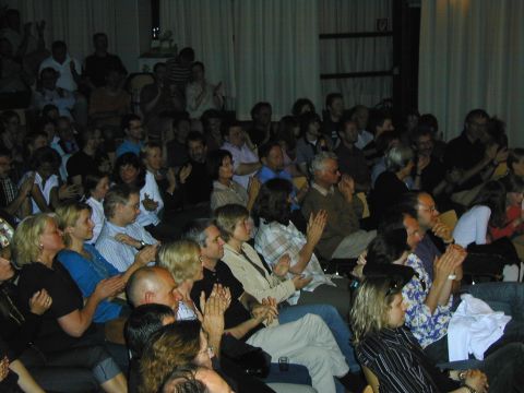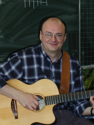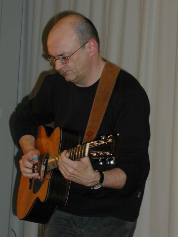 Das zur Veranstaltung gehörende öffentliche Konzert am Samstag war wieder einmal ein besonderes Erlebnis. Neben einer Reihe von "Stammgästen" sah man erfreulich viele neue Gesichter, obwohl, wie ich mir nachträglich sagen lassen musste, viele Interessierte nichts von dem Konzert erfahren hatten. Hier muss ich mir in Zukunft mehr einfallen lassen. Das Konzert begann mit einem Solo-Set von Jacques. Wieder einmal demonstrierte er, warum er weltweit zu den führenden Fingerstyle-Gitarristen zählt. Seine bunte Mischung aus verträumten Melodien, mitreißenden Rockstücken und perkussiven Elementen ließ das Publikum begeistert mitgehen. Diverse witzige Einlagen betonten die sympathische Ausstrahlung von Jacques. So baute er z.B. kurzerhand eine knarrende Tür während seiner Darbietung als Improvisation in das Stück ein, indem er das Geräusch wie ein Echo auf seiner Gitarre nachahmte.